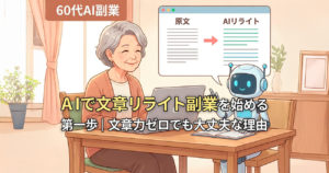 AI文章リライトは60代の「最初の副業」に最適 第3回 AIで文章リライトする方法 文章リライトは、「AI副業の中で最も簡単に始められる仕事」と言われています。しかし多くの60代の方はこう思っています。 その不安、すべて […]